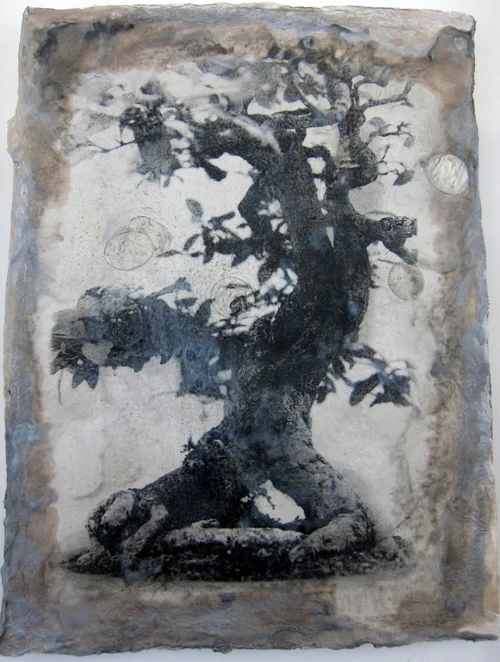 Starting with fibers from plant material, a pulp is created for paper-making. Each sheet is hand formed and design elements from natural materials are added. The texture of the paper along with the tones from natural flax, cotton and banana leaf are strong components of the final photographic print. I continue to re-work the surface by applying encaustic, oil, pastel and graphite.