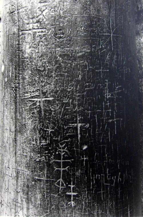 My eye was intrigued by the symbols carved into the stone showing generations of travelers leaving their mark. The work is film based, printed on hand-sensitized paper for chemical processing. The final print has layers of encaustic wax applied, adding texture and depth.